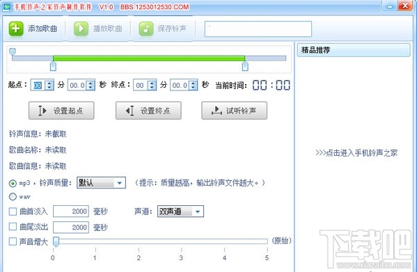 手机铃声制作工具是一款以切割音频来制作手机铃声的工具。这款小巧实用的软件能将你喜欢的一首歌曲分割成若干段,用它制作的铃声非常好。 手机铃声之家铃声制作软件能够打开添加了各类各样音频文件,标记好起点,终点进行能够截取着铃声的时长,可以去设置好铃声首尾的淡入淡出功能,而声音大小能够进行很好的调整,生成MP3以及WMV格式音频文件。