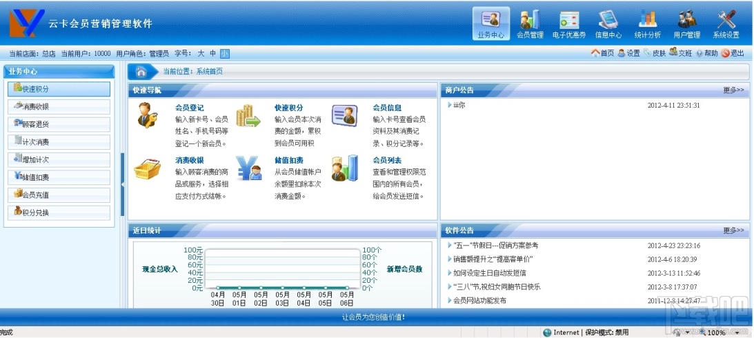 云计算会员管理软件功能说明: 支持跨地域的全国连锁分店使用 支持多种积分方式,如电脑、固定POS、移动POS等 灵活设置店面折扣、积分规则,储值规则 会员可上网查询积分记录和总积分(新增兑换礼品,订购功能,在线充值共) 独有“手机会员卡”功能,将会员卡与手机号绑定,忘记带卡可报手机号积分 独有的积分、扣费短信通知功能 电子优惠券,短信/彩信群发 微信会员卡功能,顾客扫描微信二维码即可注册成功会员,快速发展新顾客;