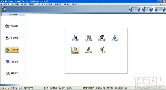 ◇ 解决校长最关心的问题: 1.随时知道实际收款情况; 2.随时知道多少人欠费、欠多少费、各班各系各年度欠费情况、交费费率; 3.随时知道新生到校人数和交费情况; ◇ 解决财务欠费管理难题: 1.欠费报表随时可生成; 2.随时统计各学生各年度累计欠费和明细欠费情况; ◇ 减轻财务人员工作量 1.各收费项目明细可随时统计和打印,提供给财务作帐,避免手工统计的烦琐; 2.初始化数据可批量导入; 3.欠费情况可随时查询; 4.整个收费过程采用傻瓜模式,不需要财务人员输入学号和任何汉字,只要点击鼠标和输入实际交费总金额即可; ◇ 数据安全可靠: 1.加密数据库,并且数据库具有自动备份功能; 2.各模块采用授权使用方式; 3.数据修改,系统将自动记录修改人和修改金额; 4.票据作废,系统将自动记录操作人员和票据明细及日期; 5.随时可查询统计票据作废和数据修改情况; ◆ 适应对象:各大、中、小学学校、幼儿园、培训机构。 ◆ 开发背景:目前许多学校对学生的学费、住宿费、书籍费等,采用人工收费,手工开票来完成,然后凭借发票,财务手工生成台帐。这样以来,开学时,学校的交费窗口总是学生拥挤不堪,财务人员手忙不停,做着大量重复而又不得不做的手工劳动。做台帐时更难,需手工将发票上的数据往电脑中填,这样的重复劳动,一个人需要十天半个月甚到个把月才能录入完,而且又容易填错、填漏,查询起来非常困难。有的学校虽然采用银行代收,但台帐必须手工来完成。针对以上这种情况,我司开发了《学校收费管理系统》,提供多种数据接口,批量数据可一次性导入,减轻财务人员的录入工作量,各学校可通过利用计算机,规范、整合开票流程,实现信息多方位共享。 ◆ 系统目标:本系统主要是对学生交费以及银行代收学费情况进行系统管理。及时反映学生的交费、欠费情况。提供学费台帐的及时性、准确性及规范性管理。如学校实行银行代收、代扣学费,可轻松实现大量银行数据一次性导入,从而使繁锁、复杂的票据管理变得轻松、明晰。 ◆ 系统特点: ◇ 先进的管理思想(支持公共财政,政府非税收入) ◇ 灵活方便的可操作性 ◇ 实时的信息传递与过程查询 ◇ 多层次的权限控制 ◇ 全方位的开放与兼容(数据可以导入、可以自由导出) ◇ 数据库自由连接 ◇ 支持网络收费,支持断网移动收费 一、系统管理 1、重新登录 2、用户管理 3、修改密码 4、数据库配置 二、基本设置 1、单位设置 2、学校结构 [分校、院系管理、专业管理] 3、收费项目 4、数据字典 5、系统选项 三、学籍管理 1、年级管理 2、班级管理 3、学生档案 4、档案导入 5、批量修改档案 6、照片采集 7、综合查询 8、档案统计 9、学籍变更 10、批量调班 11、变更财务确认 12、欠费检查 13、毕业处理 14、毕业登记 15、毕业查询 四、票据管理 1、票据类型 票据增加、修改、删除、设计样式、公式 2、票据入库 3、票据查询 4、票据分类报表 五、收费管理 1、管理管理 2、收费标准 [应收金额精确到班级] 3、特殊处理 [应收金额精确到个人] 4、减免管理 5、前台收费 [收费并打印] 6、批量收费 7、退费管理 六、报表管理 1、学生缴费明细表 2、学生缴费统计表 3、学生缴费汇总表 4、个人缴费统计表 5、综合缴费统计表 6、项目统计表 7、任务统计表 8、减免统计表 9、欠费统计表 10、退费统计表 11、流水账 12、万能统计表 七、数据管理 1、数据备份 2、数据恢复