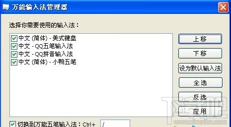 这是从万能五笔中提取出来的万能输入法管理器,可以非常方便的管理你的电脑上的输入法。 1、调整输入法的次序; 2、将不用的输入法关闭(去掉勾选),以提高我们切换输入法的速度; 3、设置任一输入法为默认的输入法,即你一开机就切换到默认的输入法。