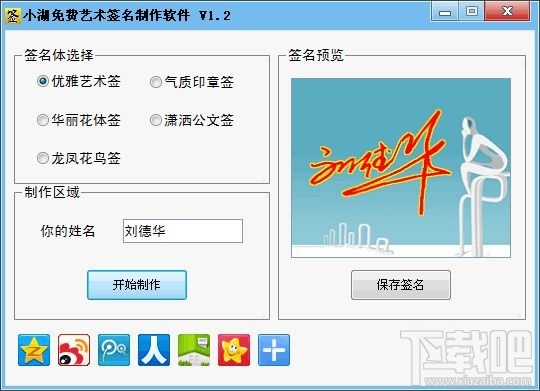 小湖免费艺术签名制作是一款在线制作艺术签名的软件,不但可以设计出好看、个性的签名,重要的是,你可以对照练习,最终能够一笔神来,这才是本软件的目的所在! 本软件操作简便,只需两部就可以制作出属于自己的艺术签名。目前提供了:优雅艺术签,华丽花体签,潇洒公文签和气质印章签 四种签名体随意挑选。是一款值得收藏的免费签名设计软件。
