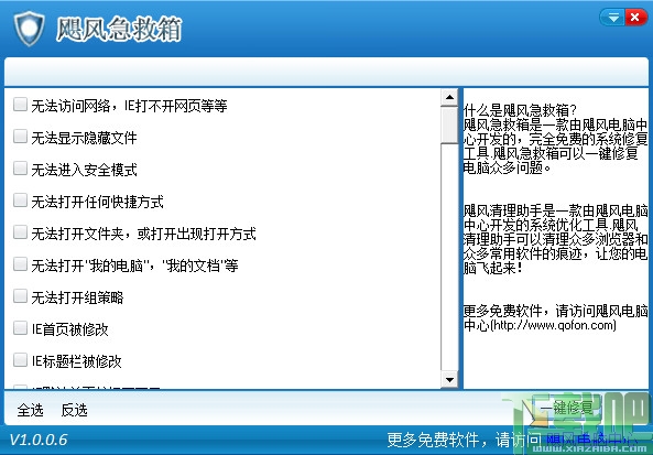 飓风急救箱是飓风电脑中心的又一力作。飓风急救箱是一款绿色软件,简洁明了的界面,无广告无插件无病毒,给予了用户一种良好的体验。电脑无法打开安全模式,无法打开任何快捷方式,无法打开文件夹等常见的系统顽症,在飓风急救箱的面前都显得不堪一击。强力的修复,独特创新的技术,造就了飓风急救箱不凡的实力。飓风急救箱这款仅有几M的绿色软件,是每台电脑都应该拥有的必备软件。