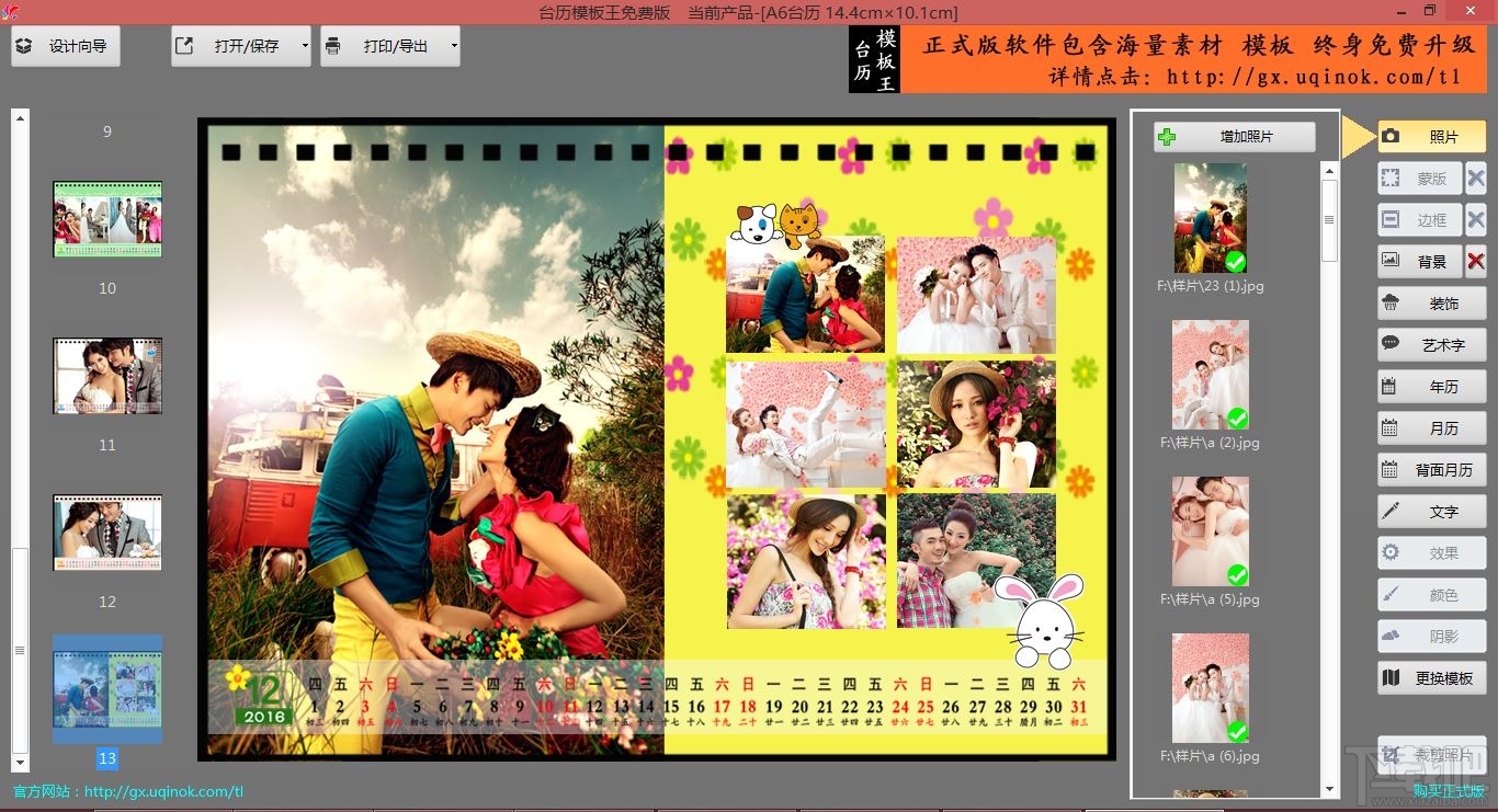 台历模板王是国内高级的台历设计软件,使用者无需任何设计基础,轻点鼠标,便会自动生成专业效果的台历图案,您只需打印制作即可,是个性DIY创业的有力助手。