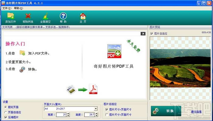 奇好图片转PDF工具一款把多张图片(支持多种图片格式)生成为PDF文档的免费工具。 是不是想把您的多张相片保存为pdf文件?把从网上下载的各类照片保存为PDF文件?通过扫描仪扫描的文件,想转换成PDF文件?这款软件可以帮您实现。