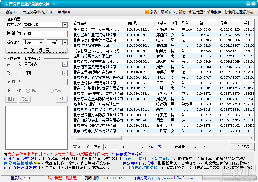 百分百企业名录搜索软件,是一款可以按照关键词、地区及行业等字段,自定义搜索条件,精准的采集出意向企业及客户联系方式的一款软件。可以采集到座机、手机、电子邮箱三种联系方式,每条信息包括公司名称、法人、联系人等10多种字段。数据量庞大、精准且更新及时,是您做电话销售、短信群发、邮件群发等营销的必备软件!