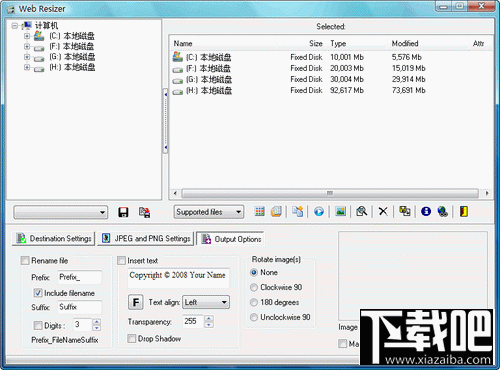 Web Resizer让你可以压缩,重新设置尺寸以及转换你的图像,添加一个水印,改变 DPI,还可以进行镜像图像调整(亮度,饱和度,锐化)。该软件主要用于处理多幅图像,但是也可以用于重新设置尺寸或者转换单独的图像。该软件支持 JPG, JPEG 2000, PNG (8位和24位), BMP 以及其它若干图像格式。你可以选择在处理过程当中采用哪种操作,并且可以有选择地联合使用重新设置尺寸和图像转换以及其它选项。