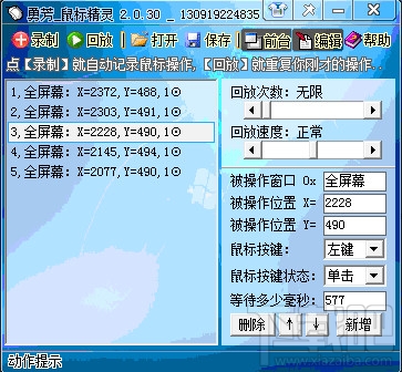 勇芳鼠标精灵一个录制和重放鼠标点击操作的软件,采用实时操作,重放鼠标点击的操作时,不影响你做其他事情(有别于其他软件的比较大区别,因为其他键盘精灵工作时,你是没法再使用电脑的),正因为是实时的,所以每次使用时,必须先录,再重放,不能保存,实时保存后下次再用是没有效果的,所以本软件,只用在简单的操作,如:用在网络游戏中的重复采集物品,钓鱼等。或者是一些简单的刷分,重复点击网页等等。凡是步骤简单,重复的鼠标点击操作,都可用本软件来完成,因为他工作时,你自己还能正常使用电脑。
