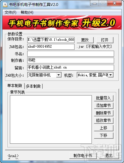 书吧手机电子书制作工具是一款简单易用、功能强大、界面美观的手机电子书制作软件,您可以使用它将常用的TXT文档制作成JAR手机电子书。在制作电子书时,可以自动切割电子书文本,使电子书可以容纳任意多的内容。界面友好,操作简单,是一款很实用的工具哦!