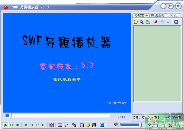 SWF另类播放器一款精致实用的SWF文件播放器,SWF播放器能将Flash 文件添加到列表连续播放,播放时能切换到全屏;真正实现了快进和快退功能;本软件比较大特点是提供了网络动画库,只要你的电脑接入英特网,就可随时欣赏精彩的Flash 动画而无需你自己动手去搜索,网络库经常更新,到目前为前已收藏了近千个动画;5.0版重写了播放网络动画功能的代码,克服了以前版本在下载动画时程序没有响应的毛病,大大方便了用户使用,5.2版提供了功能强大的采集网页中的动画的功能;6.2版本添加了“搜索IE缓存动画”的功能。