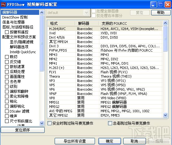 解码、编码器。它能够解码的视频格式已经远远超出了mepg4的范围,包括indeo video、wmv、mpeg2等等。同时,它也提供了丰富的加工处理选项,可以锐化画面,调节画面的亮度等等。不止是视频,FFDShow现在同样可以解码音频,AC3、MP3等音频格式都可支持。并且可以外挂winamp的DSP插件,来改善听觉效果。