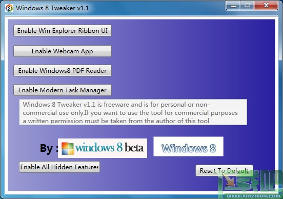 实际上,由于仍在开发当中,很多Windows8新功能被隐藏了。通过Windows 8 Tweaker这个Windows8优化工具,能帮助你轻松启用Ribbon界面、新的摄像头应用以及Windows 8原生的PDF阅读器和全新的任务管理器等。