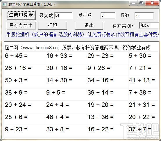 小学生口算表,让你自己东西给您的孩子制作任意四则运算口表,从每日一练中逐步提升您孩子的笔算和口算和心算能力,是教师教学和学生提高素质的实用软件。