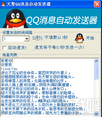 qq消息自动发送器,可以自动发送qq消息给qq好友,软件解压后你会得到一个 message.txt 文本文档,里面储存了所有等待发送的消息。 把你想要说的话依次填写在消息列表里,设定发送时间间隔,点击开始就能自动给qq好友发送消息了。
