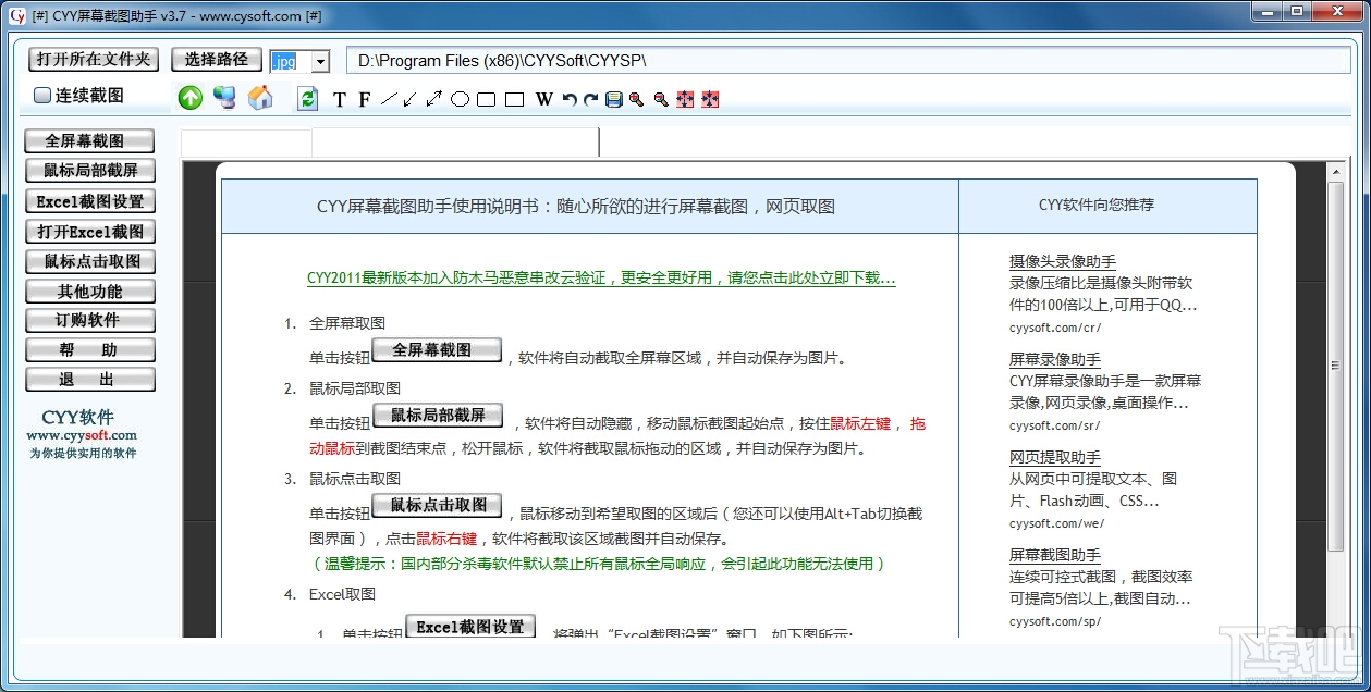 CYY屏幕截图助手软件功能,鼠标局部截屏功能:单击按钮鼠标局部截屏拖动鼠标放开,鼠标拖动区域将自动截屏。自定义截屏功能:鼠标区域截屏、全屏幕截屏、截取当前的窗体、截取客户端区域;截屏图片自动保存功能:截图后可自动保存到当前文件夹,文件名格式为;自动保存到剪贴板:在截图时会自动保存在剪贴板中,当按Ctrl+V时,可自由剪贴到Word等工具中。多种图片格式保存:截取的图片可以任意保存为:jpg,jpeg,bmp,ico,emf,wmf六种格式。图片修改保存功能:对截图加入文字、设置文字格式、加入箭头、 圆角长方形等,并保存修改的结果。自定义快捷组合键:当组合键发生冲突时,自动显示冲突的组合键,并可自定义组合键。