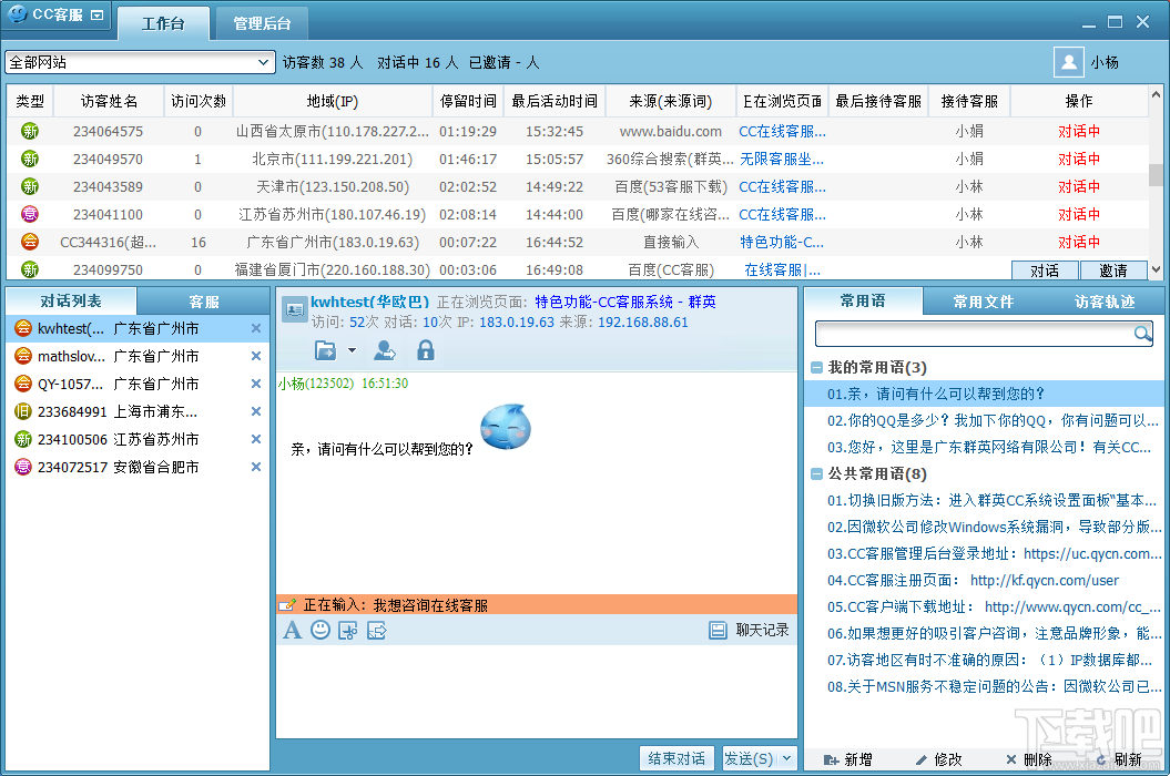 CC客服是集在线即时通讯、访客监控、流量统计、客户管理等于一体的先进互联网在线客服系统。系统能像雷达一样对网站进行实时监控,有效把握访客IP、来源、搜索关键词、访问页面等,广告投放效果一目了然。同时,可以对正在访问的访客发起主动对话,化被动等待咨询为主动销售。目前已经有简、繁、英、俄等多种语言版本。
