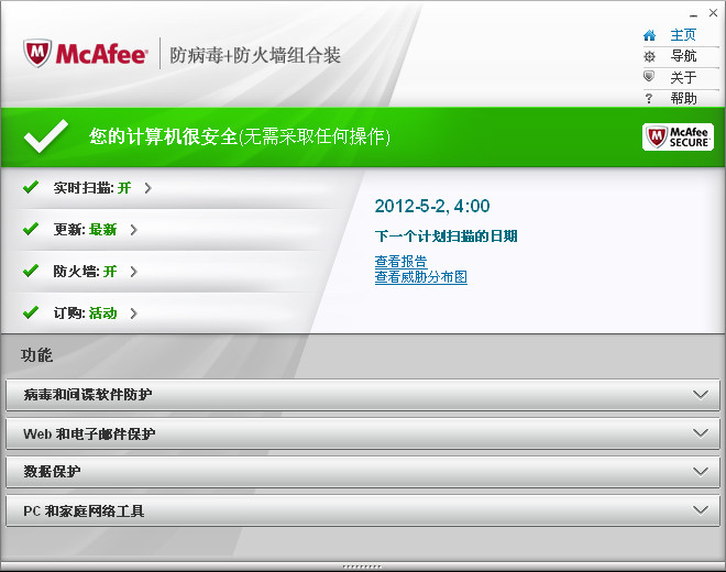 Mcafee VirusScan Plus 2012(迈克菲防病毒防火墙组合装)包括反病毒、反间谍、防火墙、web安全防护等,让每个人都可以毫无困扰地实现PC,使PC免受病毒和间谍软件的,并通过所含的防火墙抵御黑客。