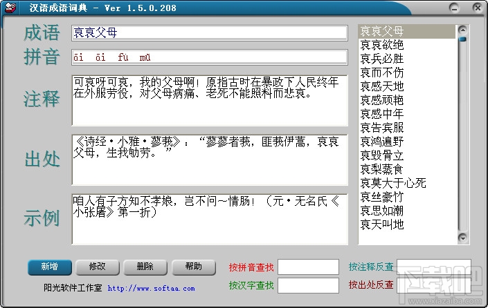 汉语成语词典共收录汉语成语13000多条,包括拼音、注释、出处、例句,同时提供方便的查找功能:可以按照拼音首字母查找、汉字查找,还可以按照注释或出处反查成语;同时您还可以利用词典维护的功能进行成语库的扩充、修改。