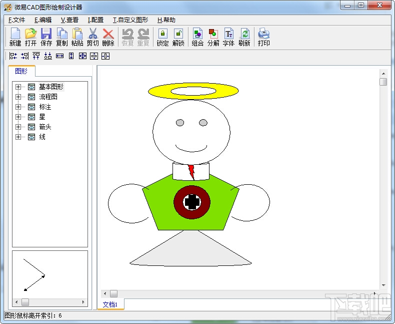 微易CAD图形绘制设计器体积小,绿色免安装,关键是使用超级简单,是小型绘图的得力助手。主要用于师生教育教学之用,比如:生物、物理,化学,数学绘制教学图形,地理绘制底图等。微易CAD图形绘制设计器功能结构:1.菜单区:各种功能菜单和命令。2.图形区:图形组件,工具导航。3.工作区:绘图平台。微易CAD图形绘制设计器使用方法:1.创建基本图形组件:方法一:选择左侧图形组件导航,当击任一图形组件,该组件即可在左下角预览区战士,绿色原点为旋转,黄色原点为变形,可以任意拖动大小。修改完毕,双击该预览区即可把已经修改好的该图形转移到工作区。方法二:选择左侧图形组件导航,双击任一图形组件,该组件即可转移到工作区.2.图形组件编辑:点击工作区左上角刚刚建立的图形组件,拖曳至适当位置,绿色原点为旋转,黄色原点为变形,可以任意拖动大小。单击右键弹出图形组件属性框,只有绘制图形。3.几个图形组件可以组合或分解,任意图形组件可以锁定或解锁.软件提供了111个基本组件不够用的情况下可以自定义图形组件。4.保存或打印。可以对保存的绘图文件进行编辑修改。