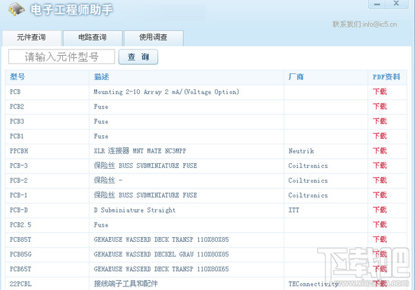 用于查找器件资料,方便器件封装绘制。还能查找相关电路,查到所有电子元件,并提供下载PDF电路图
