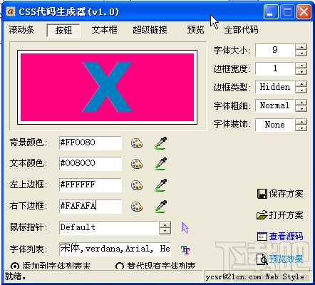 一个可视化的对滚动条,按钮,文本框,超级链接自动生成css代码的工具,生成后可即时预览效果。网页制作初学者的良师益友!