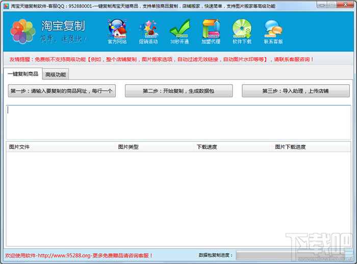 1秒复制淘宝的单个宝贝,分分钟就能把其他店铺的所有宝贝复制到自己店铺里,史上最简单速度最快的淘宝宝贝复制软件,超过10万淘宝卖家的选择! 详细介绍: 95288淘宝天猫店铺复制软件使用的是淘宝的官方接口,几乎100%的可以正确下载宝贝属性!您再也不必手动一个一个上传宝贝了!分分钟就能上货几千个宝贝! 使用最简单的淘宝复制软件,你造吗?3个步骤鼠标点点就轻松上货几千个宝贝!完全不像有些店铺克隆软件,需要手动操作很繁琐。 使用95288淘宝天猫店铺复制软件可以复制多张主图,多线程下载图片,速度就是快!完美下载淘宝商品的销售属性,导出文件支持淘宝助理各个版本,兼容性好,是您淘宝开店的必备工具软件。 使用95288淘宝天猫店铺复制软件,上货和世界杯一个都不落下!