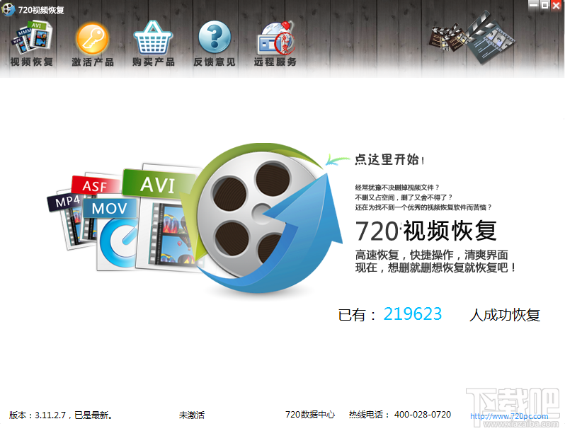 720视频恢复是针对生活中常用视频文件类恢复的专业级数据恢复系统,该系统继承了720系列产品一贯的易用性,拥有强大的数据恢复功能,可以快速恢复被误删除、误格式化、分区丢失以及误GHOST产生的视频文件丢失。本系统采用视频识别扫描引擎,在恢复的过程中,不会对硬盘的数据产生任何破坏性的读写操作,扫描后,该系统把丢失的视频文件在内存中重新建立。