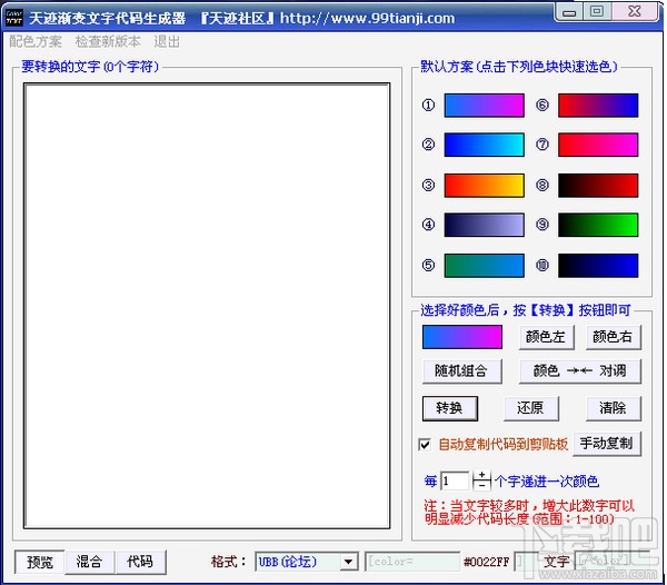 渐变文字代码生成器简体中文绿色免费版是一款可以轻松把一段文字生成渐变颜色代码的绿色软件,当你在软件中输入完要转换的文字后,只需要挑选自己喜欢的起始颜色、结束颜色后,按一下“转换”按钮即可生成相应的论坛/网页/QQ空间以及自定义格式代码,并且代码可以自动复制到剪切板中,回帖时直接粘贴代码即可不错得文字代码生成器,让你得文字更加漂亮。