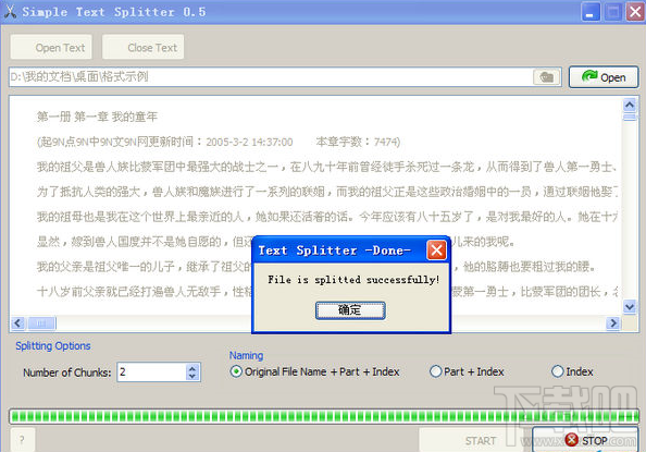 txt小说分割器-Simple Text Splitter,能分割文本文件的小工具,支持分割txt、log、srt格式的文本。 用手机、mp3看小说的朋友有福了,用这款小说分割器就能把体积动辄几兆的电子书切分为几百KB大小的小型文本文件,免去一次打开数兆文件时引起的假死现象。