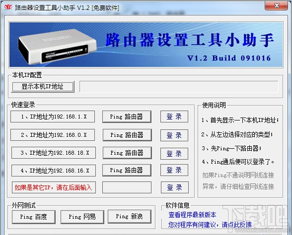 路由器设置工具小助手,可以自动获取网关,输入路由账户密码就可以设置,很适合新手使用。 由于不同路由器采用不同IP地址登录管理,对于经常需要登录路由器管理或查看的人来说,频繁键入IP地址是非常麻烦的事情,需要无打开浏览器,再输入IP地址才能登录,本程序收集三种常见路由器管理地址,只要点击对应的IP地址后面的IP地址,就能快速出现登录界面,省去不少麻烦