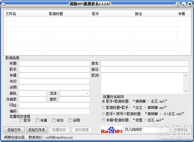 闹猴MP3批量更名IdealMP3Rename是一款比较强大的MP3,WMA文件批量改名软件,而且软件体积也相对比较小. 操作方便、简单易用, 很直观! MP3,WMA文件修改让用户可以简单地对单个mp3,wma或批量mp3,wma进行标题,歌手,专辑,说明,年份以及文件名的修改。 批量修改:选择一个改名规则后,然后点击“文件改名”则前面勾选的文件都会被按照改名规则进行修改。