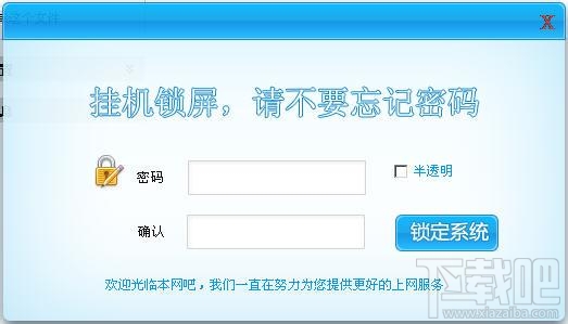 深蓝挂机锁特色 1,程序有万能密码,方便在顾客忘记密码的情况下,网管助其解锁(防止重启系统导致数据丢失)。 (可自定义,自定义方法见8) 2,简洁清爽,风格怡人。 3,可选半透明或者不透明,考虑到保护隐私与监视显示两方面需要。 4,禁止win键。 5,禁止CTRL+ALT+Del锁定系统,与注销系统。或者关机。 //感谢XBS建议 6,禁止WIN+L锁定系统。