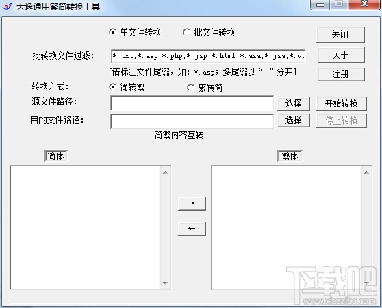 可进行繁体字与简体字的互转,适用于任何文本性质的文件。并对图片,可执行文件等一些二进制文件自动过滤,实现了文件夹的批文件转换,特别适合大型网站的繁体简体一次性互转