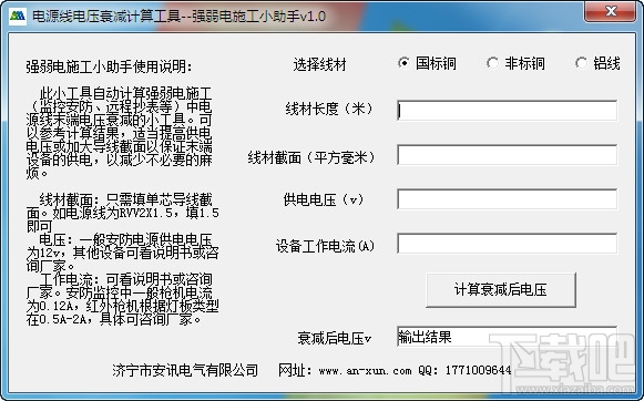 强弱电施工小助手(电源线电压衰减计算工具)自动计算强弱电施工(监控安防、远程抄表等)中电源线末端电压衰减的小工具。可以参考计算结果,适当提高供电电压或加大导线截面以保证末端设备的供电,以减少不必要的麻烦。 线材截面:只需填单芯导线截面。如电源线为RVV2X1.5,填1.5即可 电压:一般安防电源供电电压为12v,其他设备可看说明书或咨询厂家。