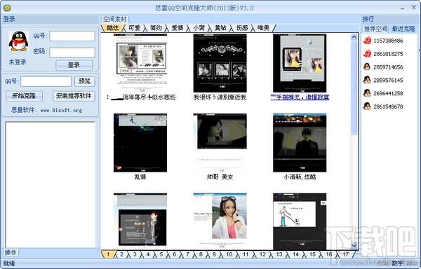 思量QQ空间克隆大师是一款可以瞬间将别人漂亮的QQ空间装扮克隆到自己空间的软件。即使不会做模块、皮肤,也可以一键搞定把别人装扮好的方案迅速克隆出来,装扮到自己的空间,大大节省QQ空间装扮时间,也为那些不会制作模块、皮肤的网友提供了方便! 我们提供上万个QQ空间模版供您选择,通过克隆空间让您的QQ空间变得更加绚丽。