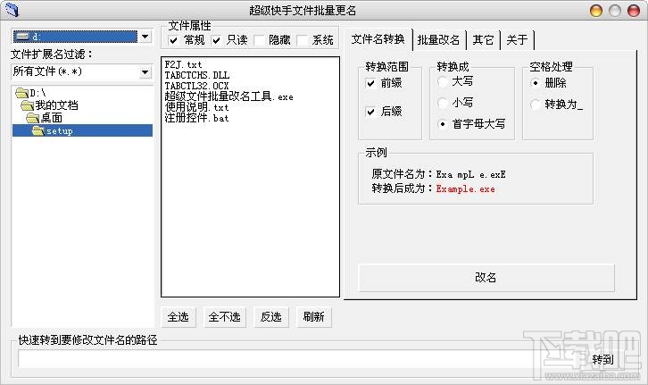 超级多面手文件批量更名工具除了批量更改文件名称、导入自定义文本外,还具有修改扩展名,大小写转换,空格处理,添加前缀,后缀,文件名称简繁转换,自动按规则生成文件名称,超强搜索常规文件,系统文件,隐藏文件等功能。