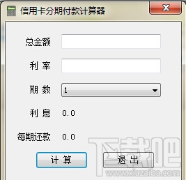 信用卡分期付款计算器输入总金额,利率,分期数,点击“计算”按纽,就可以得到利息,每期还款金额。旨在帮助用户计算分多少期才是最划算的一种理财计算软件。