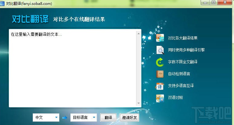搜霸对比翻译提供即时免费的中、英、日、韩等语种的全文翻译服务。对比翻译,结果更精准!由搜霸天下倾力打造!对比呈现翻译结果,好结果,即时看。搜霸出品,必属精品! 搜霸对比翻译同时使用国内外多种翻译引擎,翻译结果对比显示,轻松获得最准确的翻译结果。再也不必为机器翻译的呆板而愁眉苦脸!