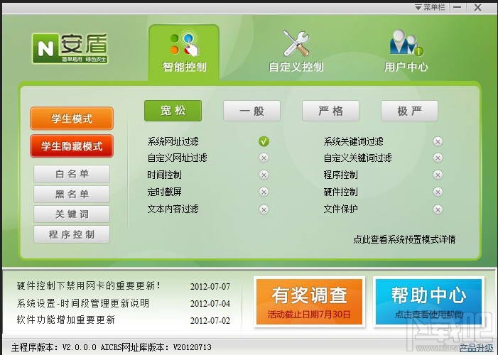 5、简单易用:家长、学生模式简单切换,所有设置可通过点击主窗口大图标、主窗口右上角菜单项、通知栏右键菜单三种方式打开,所有配置参数的修改最多只需三次点击。软件中预置宽松、一般、严格、极严四种模式,滑动鼠标即可轻松设置。