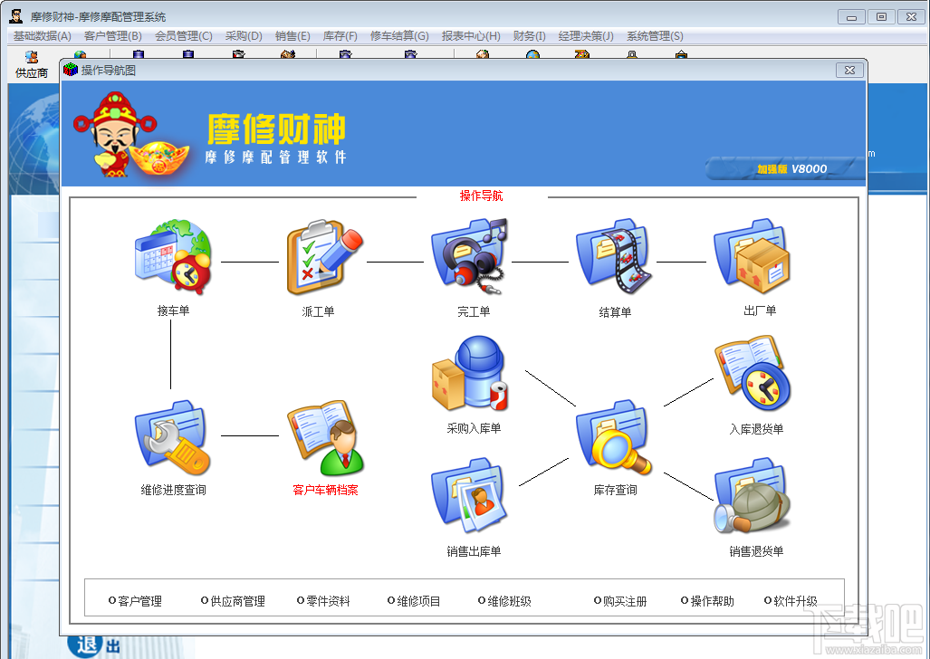 摩修财神-摩托车维修管理软件 根据摩托车维修行业的业务特点,我们以现代科学管理理念为基础,集国内外先进管理思想,并结合自身多年积累的开发经验,在高集成、简操作、方便管理、使用的原则指导下,充分考虑到中国国情下中小企业财务管理和经营实务的特点,采用业务导向型思路,使用者可以无需懂会计或特别的电脑知识。是目前国内最专业的摩托车维修、配件销售管理软件。在行业用户中享受极高的声誉。