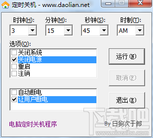 盗链自动关机程序可以指定时间关机,可以按照用户的意图实现: 1.指定时间关闭系统 2.指定时间重启计算机 3.指定时间注销计算机 4.并可自行断掉计算机电源,也就是彻底关机 5.也选择可以由用户断电……