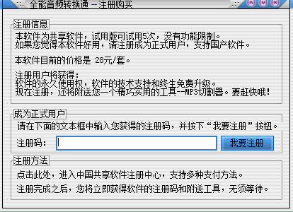 音频转换通是一款专业的音频转换工具。支持各种常见的音频格式之间的转换。可以批量转换文件而不必理会它们的源文件格式和目标文件格式。内置播放器支持多种格式的播放功能。典型的应用:WAV转MP3、WAV转WMA、WAV转AAC、WAV转AC3、MP3转WAV、MP3转WMA、MP3转AAC、MP3转AC3、其它格式转AMR、CD转WAV等。