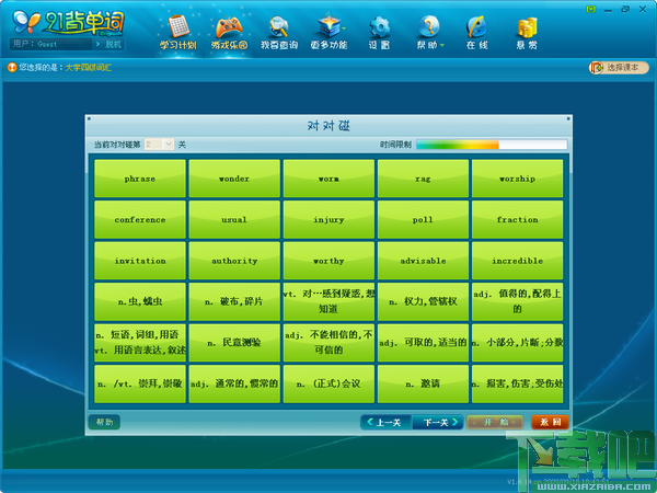 91背单词是一款由网龙公司推出的免费创新的英语学习软件,丰富有趣的英语学习游戏,会让你惊喜于平日枯燥乏味的背诵单词竟也可以如此的充满趣味。不仅如此,91英语学习软件全程根据艾宾浩斯的记忆曲线理论来进行设置,符合科学记忆法的高效记忆。另外还有强大的功能技术作为支撑,如强大的自制词库、方便实用的同步功能、丰富有趣的小游戏、婀娜延伸的星型词典等多种功能,是新一代的英语学习软件。