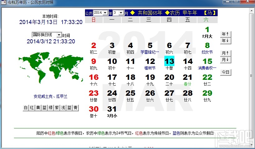 今科万年历是一款采用了现代高精度天文算法的万年历,软件小巧,界面简洁,方便实用,公历农历对照,可以同时显示公历、农历、节气、国际节日、年月日干支、生肖等,可查询世界各地时间。