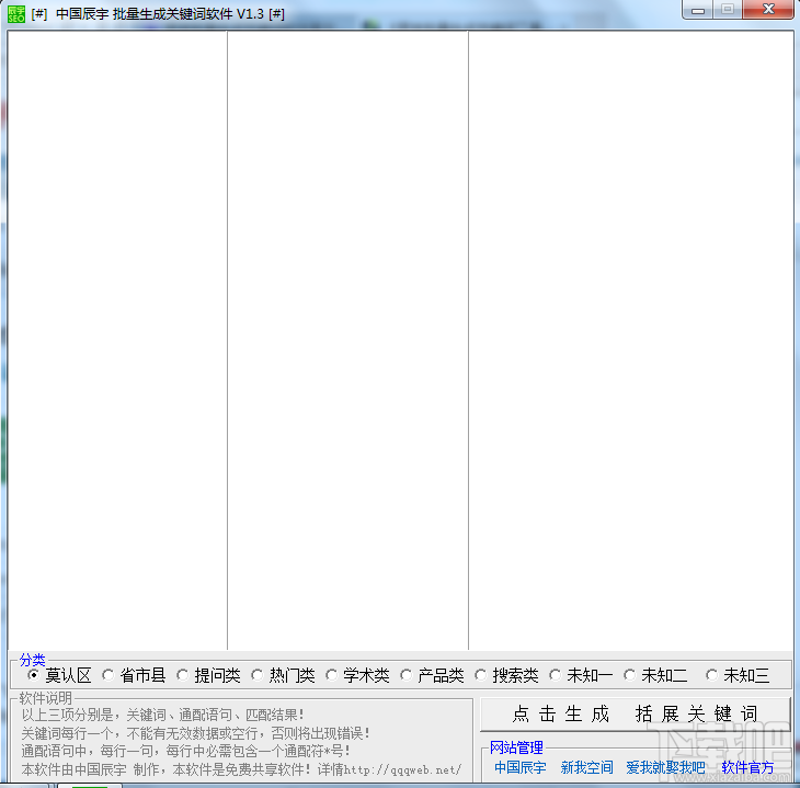 辰宇批量生成关键词软件通过用户自己设置的核心种子关键词,软件可以快速批配出,大量的括展关键词,关键词生成后,每行一条,用户可设十个分类,用户在软件界面管理关键词时,输入的关键词种子,自动及时保存。