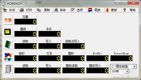 HDBENCH是一款磁盘测试工具,绿色免安装,可以很方便的测试移动硬盘、U盘等。支持分区测试,数据总量选择要比ATTO大一些。不过并没有数据包大小的选项。 软件还有其它方面的一些测试例如CPU、内存、图形性能,可以提供参考。