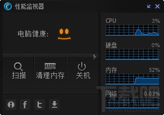 Advanced SystemCare 7中内置了一个功能强大的性能监视器,你不仅可以利用它在桌面上监视cpu、硬盘、内存、网络的使用情况,还可以利用它来快速开关机和清理内存,所以实用很强。现在把它提取了出来,解压后即可运行,并且仍然是中文界面,方便大家使用。