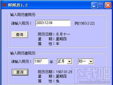 本软件不但能根据阳历查询阴历,而且还可以根据阴历查询阳历,无需安装,可以直接使用。 新增功能:修正一些BUG,增加了对星期的查询,增加了对属性的查询。