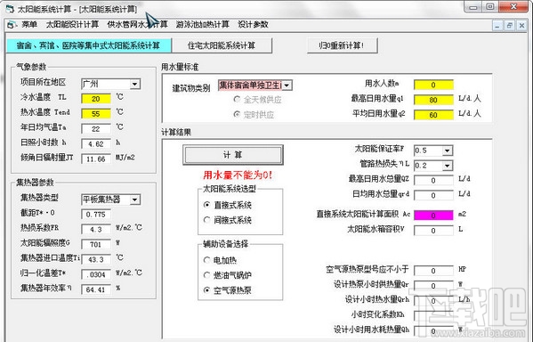 太阳能系统计算可进行太阳能系统设计计算、太阳能系统水力计算、宿舍等水力计算、工程量计算、游泳池加热计算。附带太阳能设计参数介绍。