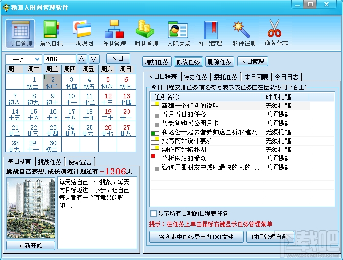 15.72 MB/2020-08-17这是一个忙碌的时代!这是一个充满激情的时代!我要让我的工作和生活井井有条,面对再多的约会、会议和事务安排我都能从容面对!因为,我拥有效能日程提醒软件!有了她的帮助,会议我从不迟到;和恋人约会,我能让她惊喜;每月电话费能及时缴纳;妈妈的农历生日我能及时准备;甚至某个节气将至软件也可以提醒我!通过直观的天、工作周、周、月或者年的日历视图,对哪天将要有什么事情一目了然;我也可以通过列表形式查看事件。软件