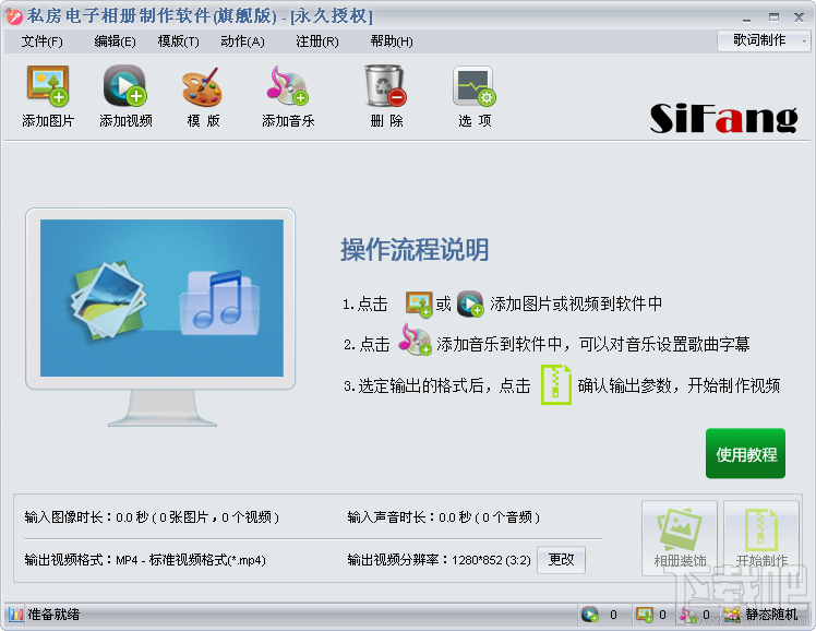 电脑上保存的数码照片越来越多怎么办?不仅占用大量磁盘空间而且也不便于平时查找和翻看。私房电子相册制作软件是一款国内市场上广泛流行的MTV电子相册制作软件,功能强大,操作简单,能够帮助用户把拍摄的照片、视频配上背景音乐、展示特效和趣味文字、歌词快速制作成一个流畅播放的电子相册视频文件观赏、保存和分享。软件提供了丰富的输出设置,用户可根据需求灵活设置输出mp4, avi, mov, flv以及VCD,DVD,iPad,iPhone等各种高清视频格式,另外软件自带的字幕编辑器还可以满足一些用户想要自己动手制作卡拉OK动态歌词字幕的实际需求,无需借助任何其他工具。私房电子相册制作软件提供了清晰简洁的使用界面,以及为每一步操作提供了描述说明,适合任何新手用户轻松独立操作。